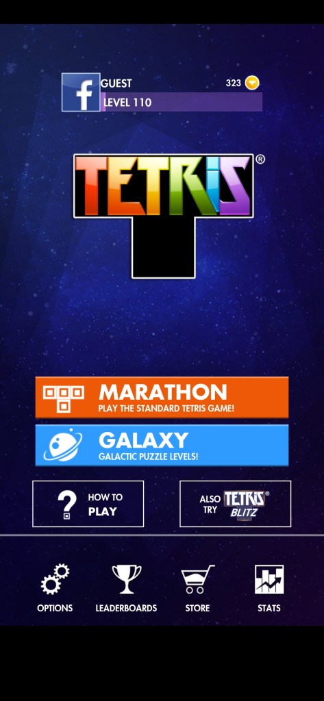 Probably the most well known classic android tetris. Calling it bad is a bit of an overstatement, I used to think that back at the day but now when the new android tetris is on google play I wish for this to come back. In this version you have, as you can see from the photo, the classic marathon mode and galaxy puzzle. You can get coins by playing and use them to revive if you fail or to buy new music, although the music part no longer works unfortunately. the game is played on portrait and controled by gestures.