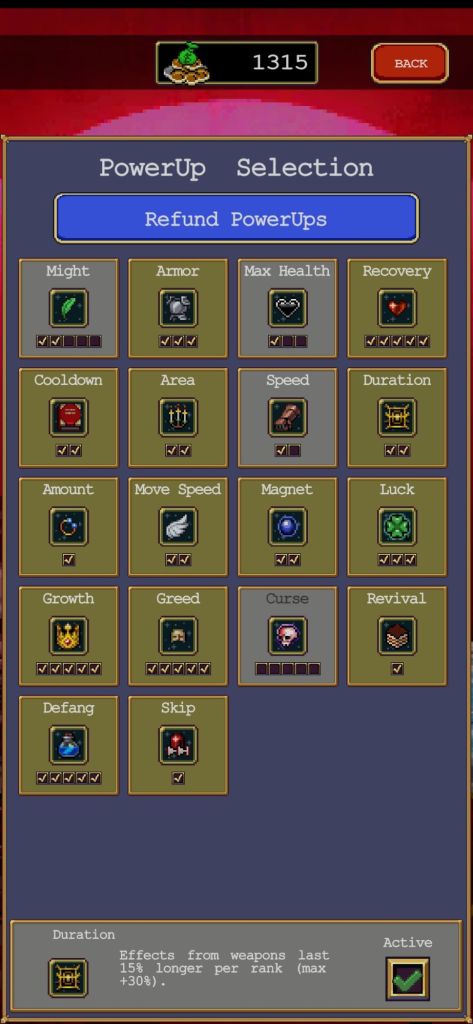 Money can be used to buy stat upgrades in the main menu. Not all upgrades and playable characters are unlocked for purchase by default and you need to either find a specific weapon/powerup or complete a challenge, such as surviving a specific amount of time on a specific map, to unlock them for purchase. Purchased upgrades and chracter abilities stack, meaning that a character with one bonus projectile and an upgrade doing the same thing gives you two bonus projectiles for every weapon.